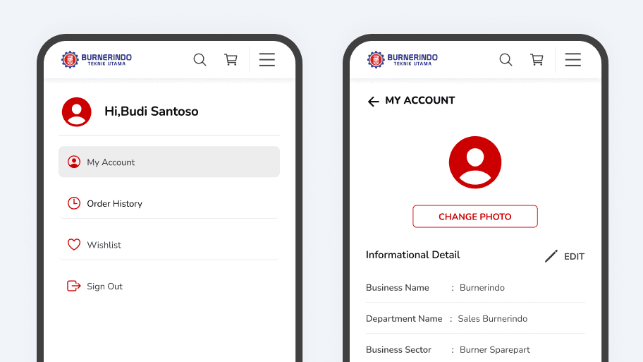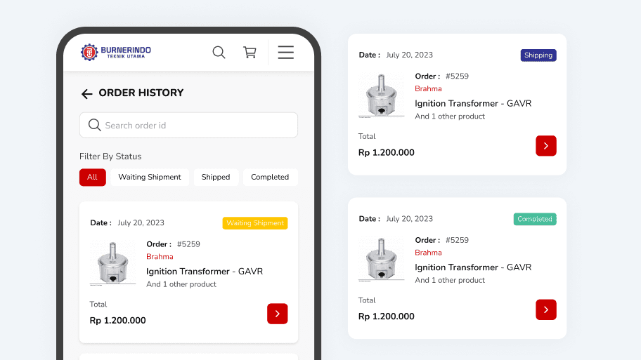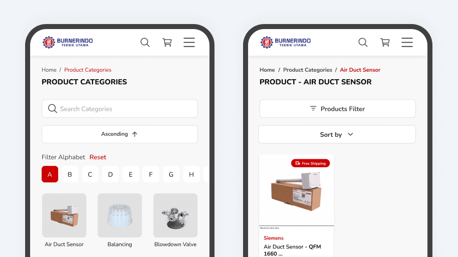 Burnindo's primary users who frequently work in the field and access information through their smartphones. They needed a fast and easy way to search for specific spare parts by brand or product type, view technical product details, and place orders — without having to sit in front of a computer.