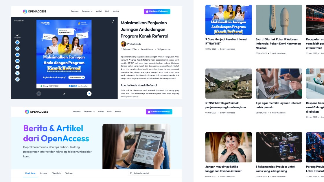 The Articles page serves a dual function — as an organic SEO driver and an entry point for prospective partners not yet ready to act. Topics covering fiber infrastructure, ISP operations, and RT/RW Net guides target the exact keywords searched by decision-makers in the network industry.