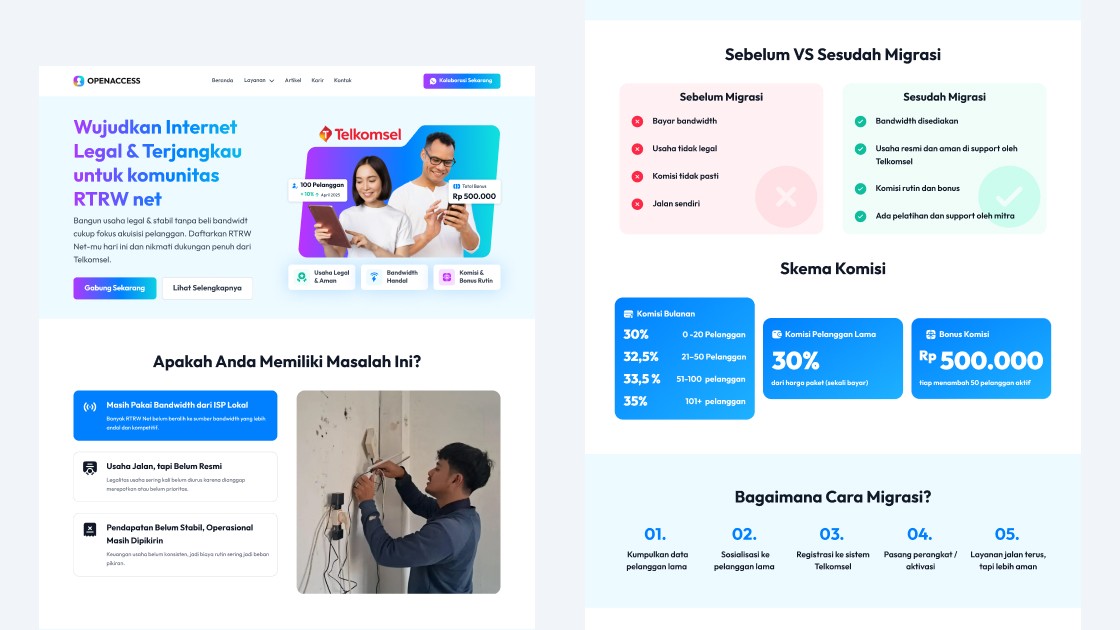 The RT/RW Net Partnership page is a new addition — designed specifically for local internet operators running informal businesses without legal standing, official bandwidth, or stable income. The structure follows small operator decision-making: acknowledge the problem, offer a solution, prove it with numbers.